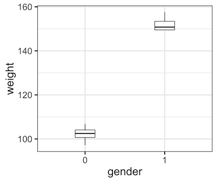 >head(df) gender weight <chr> . <dbl> 0 106.85479 0 97.17651 0 101.81564 0 103.16431 1 152.02134 1 149.46938